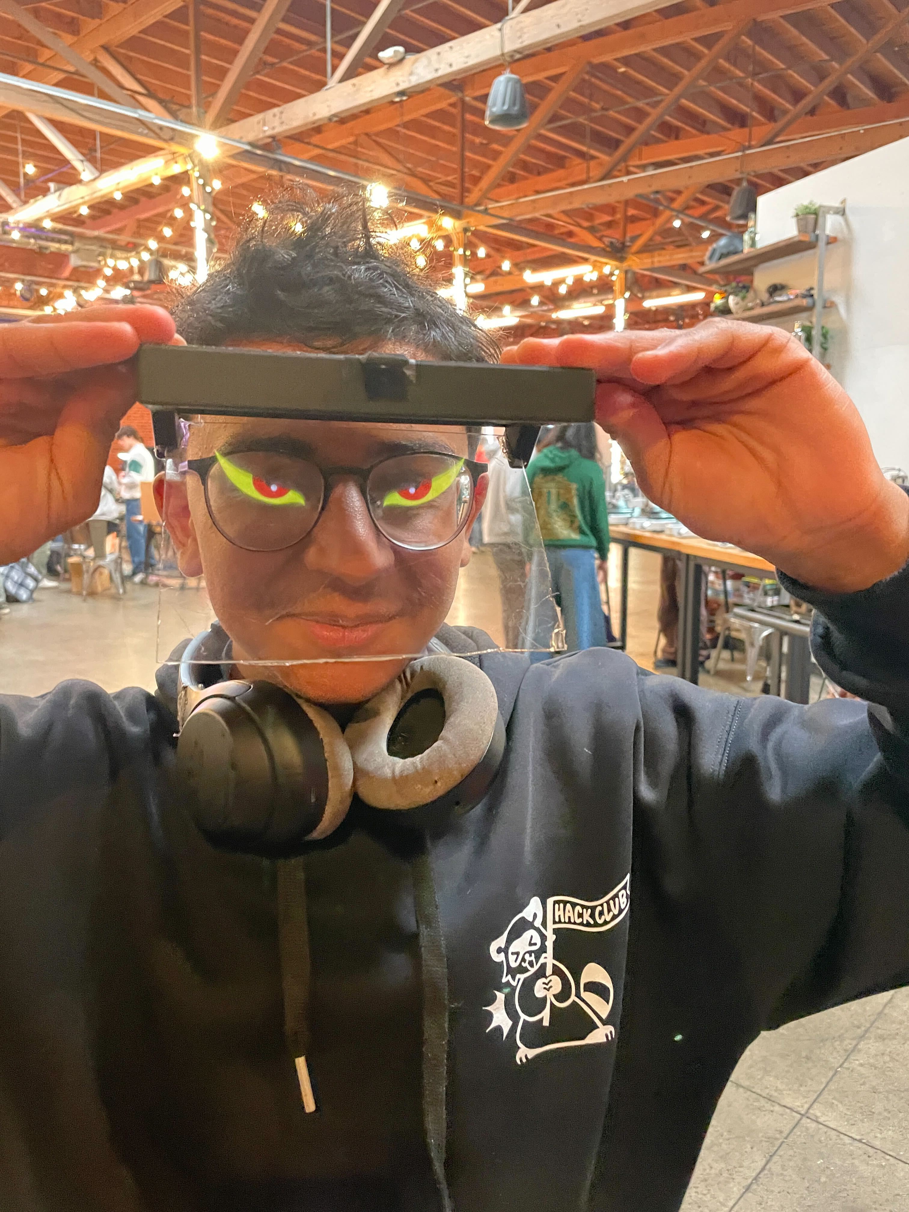 These are glasses that holographically project 'eyes' onto the user. I will insert my phone into the model, and then it will project a display onto a plastic sheet of paper. This goes over my eyes and makes me look like I have cool eyes.